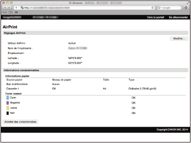 Vous pouvez afficher l'écran pour AirPrint dans lequel vous avez accès non seulement aux réglages AirPrint, mais aussi aux informations sur les consommables tels que le papier et le toner.