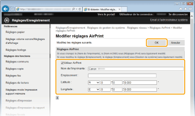Vous pouvez enregistrer des informations, notamment le nom de l'appareil et le lieu de l'installation, destinées à identifier l'appareil. Il est également possible de désactiver la fonction AirPrint de l'appareil. Servez-vous de l'interface utilisateur distante pour les modifier.