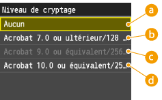 Vous pouvez configurer un mot de passe et définir le niveau de sécurité pour le cryptage d'un fichier PDF.