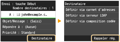 Mettre l'appareil hors tension ou régler <Limiter nouveaux destinataires> sur <Activé> a pour effet d'effacer les destinataires récents et de désactiver cette fonction. Restriction des destinataires disponibles