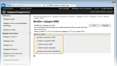 Cochez la case pour obtenir des informations sur l'appareil à partir d'un ordinateur via WSD. Cette case à cocher est automatiquement sélectionnée lorsque la case [Utiliser impression WSD] est cochée. [Utiliser lecture WSD]