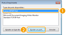 Sélectionnez [Canon MFNP Port] dans [Types de ports disponibles] et cliquez sur [Ajouter un port].
