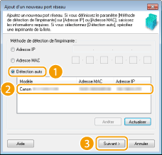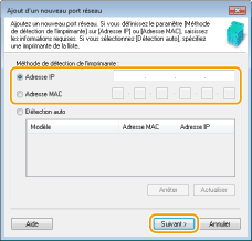 ![]() ![]() Si l'appareil n'est pas détecté Cliquez sur [Actualiser]. Si le problème persiste, cliquez sur [Adresse IP] ou [Adresse MAC], saisissez l'adresse IP ou MAC de l'appareil Affichage des réglages réseau, puis cliquez sur [Suivant].