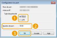 Cliquez la case d'option [LPR] ou [RAW] sous [Type de protocole], modifiez le numéro dans [Numéro de port] si nécessaire, puis cliquez sur [OK].