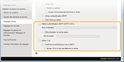 L'authentification SMTP (SMTP AUTH) requiert un nom d'utilisateur et un mot de passe pour autoriser les utilisateurs à envoyer des e-mails. Les communications avec le serveur SMTP peuvent être cryptées à condition qu'il prenne en charge le protocole TLS.