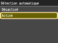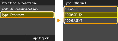 <10BASE-T>, <100BASE-TX> ou <1000BASE-T>.![]() ![]() Pour spécifier <1000BASE-T>, vous devez sélectionner <Duplex intégral> à l'étape 2.