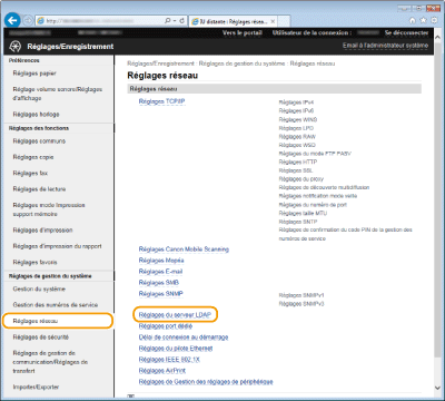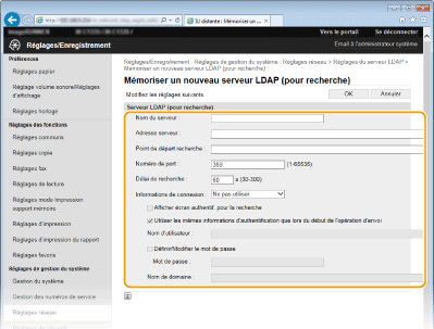Si un serveur LDAP est installé sur le réseau, vous pouvez rechercher des numéros de fax ou des adresses e-mail sur le serveur, puis les spécifier en tant que destinataires ou les mémoriser dans le carnet d'adresses. Vous pouvez mémoriser jusqu'à cinq serveurs LDAP sur l'appareil. Vous enregistrez les serveurs LDAP grâce à l'interface utilisateur distante.