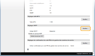 Test des communications avec le serveur NTP/SNTPVous pouvez tester les communications entre l'appareil et le serveur de temps enregistré via SNTP. Accédez à [Réglages/Enregistrement]