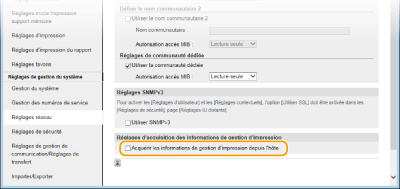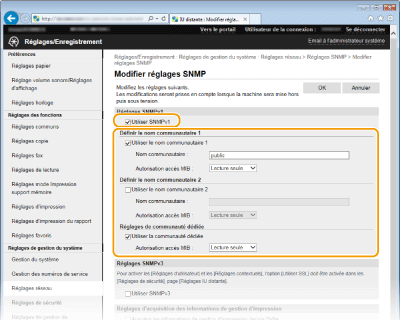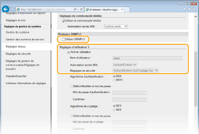 Si les deux versions du protocole SNMP sont activées en même temps, il est recommandé de définir le droit d'accès MIB pour SNMPv1 sur [Lecture seule]. Il est possible de définir différemment les droit d'accès MIB pour les protocoles SNMPv1 et SNMPv3 (ainsi que pour chaque utilisateur dans SNMPv3). Sélectionner [Lecture/Écriture] (tous les droits d'accès) dans SNMPv1 annule les puissantes fonctions de sécurité qui caractérisent SNMPv3, car la plupart des réglages de l'appareil sont alors contrôlés par SNMPv1.