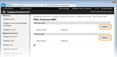 ![]() Vérification des erreurs de saisie En cas de saisie incorrecte des adresses MAC, vous risquez de ne pas pouvoir accéder à l'appareil via l'interface utilisateur distante. Si cela devait se produire, il faudrait régler <Filtre d'adresse MAC> sur <Désactivé>. Filtre d'adresse MAC