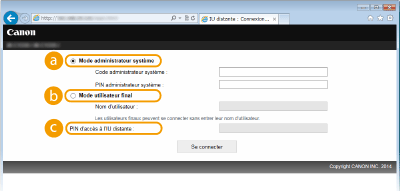 Vous pouvez effectuer toutes les opérations et tous les réglages de l'interface utilisateur distante. Entrez l'ID approprié dans [Code administrateur système] et le code PIN dans [PIN administrateur système] (