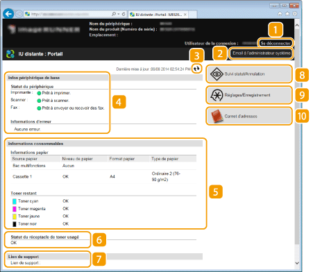 Affiche l'état actuel de l'appareil et les informations relatives aux éventuelles erreurs. En cas d'erreur, le lien vers la page d'information sur l'erreur apparaît.