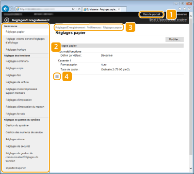 Affiche la page [Réglages/Enregistrement]. Lorsque vous êtes connecté en tant qu'administrateur système, vous pouvez modifier les valeurs des réglages et enregistrer/charger les données mémorisées.