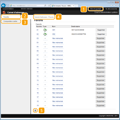 Affiche les numéros de composition codée et la liste des favoris mémorisés dans le carnet d'adresses. Vous pouvez également mémoriser/modifier le carnet d'adresses lorsque vous êtes connecté en tant qu'administrateur système.