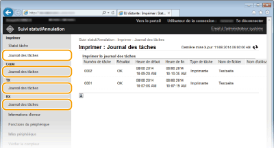 Cliquez sur [Numéro de tâche] pour les documents dont l'impression est suspendue et les documents sécurisés pour afficher leurs informations détaillées. Vous pouvez vérifier le nom de l'utilisateur et le nombre de pages sur le document imprimé.