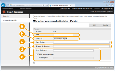 [FTP] : sélectionnez cette option si vous utilisez un serveur de fichiers. [Nom d'hôte]Pour utiliser un dossier partagé, saisissez son chemin (jusqu'à 120 caractères) ou saisissez l'adresse IP (par exemple : \\swan\share ou \\192.168.2.100\share).