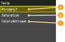 Sélectionner <Normal> ou <Normal TR> dans <Profil de sortie> et <Perceptif> dans <Méthode mise en correspondance> est équivalent au réglage de [Méthode de correspondance] sur [Perceptuel [Couleur du moniteur adaptée]] dans le pilote d'imprimante.