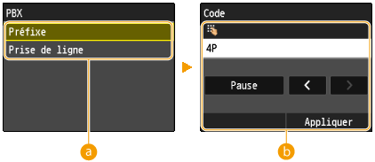 Sélectionnez le type de PBX que vous utilisez. Si vous tapez sur <Préfixe>, enregistrez le code dans l'écran suivant.
