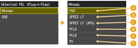 Sélectionnez une langue de description de page de sorte que l'appareil soit détecté en tant qu'imprimante compatible avec cette langue lorsqu'il est relié à un ordinateur par le réseau.
