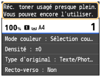 <Presque plein> : le réceptacle de toner usagé est presque plein. Il est recommandé de le remplacer par un neuf.