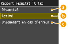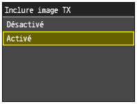 Lorsque vous sélectionnez <Activé> ou <Uniquement en cas d'erreur> pour <Rapport résultat TX fax>, il est possible d'insérer une partie du fax dans le rapport. Réglez <Inclure image TX> sur <Activé>.