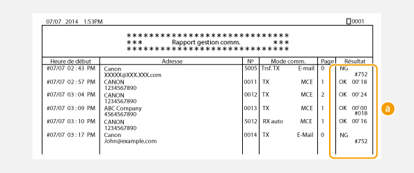 Si un code d'erreur apparaît). En cas d'envoi à une adresse e-mail, le rapport considère les résultats de la transmission entre l'appareil et le serveur de messagerie et non ceux entre l'appareil et l'adresse du destinataire à proprement parler.