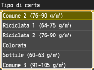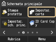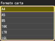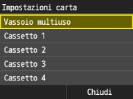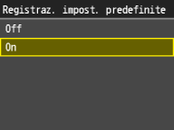Dopo aver registrato l'impostazione predefinita per la carta, la schermata dell'impostazione non viene visualizzata quando si carica la carta, e viene utilizzata sempre la stessa impostazione. Se si carica carta di formato o tipo diverso senza modificare le impostazioni, la macchina potrebbe non stampare correttamente. Per evitare questo problema, disabilitare l'impostazione predefinita selezionando <Off> al passo 3, quindi caricare la carta.