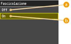 Quando si preparano più copie di documenti con più pagine, impostare <Fascicolazione> su <On> per fascicolare le copie in ordine sequenziale di pagina. Questa funzione è utile quando si preparano documenti da distribuire durante meeting o presentazioni.
