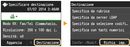 È possibile selezionare una destinazione tra le ultime tre utilizzate. Quando si specifica una destinazione utilizzata in precedenza, la macchina imposta anche le stesse impostazioni fax, come la densità, utilizzate per l'ultimo invio di documenti a tale destinazione.