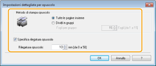[Dividi in gruppi]: stampa più gruppi divisi dal numero di pagine specificato in [Fogli per gruppo]. Rilegare ciascun gruppo, quindi combinarli come unico opuscolo. Selezionare questa opzione quando il documento contiene molte pagine che non è possibile rilegare in un singolo opuscolo.