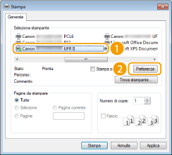 Selezionare il driver stampante della macchina e fare clic su [Preferenze] (o [Proprietà]).