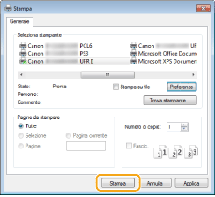 La modalità di visualizzazione della finestra di dialogo di stampa varia in base alle diverse applicazioni. Per ulteriori informazioni, consultare il manuale di istruzioni dell'applicazione in uso.