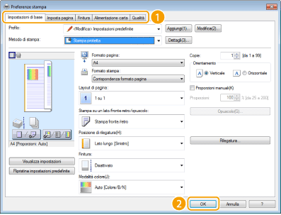 Fare clic sulle schede [Impostazioni di base], [Imposta pagina], [Finitura], [Alimentazione carta] o [Qualità] per specificare le impostazioni di stampa per ogni schermata, in base alle esigenze.
