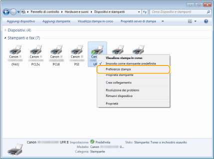 Fare clic con il pulsante destro del mouse sull'icona della stampante, quindi fare clic su [Preferenze stampa].