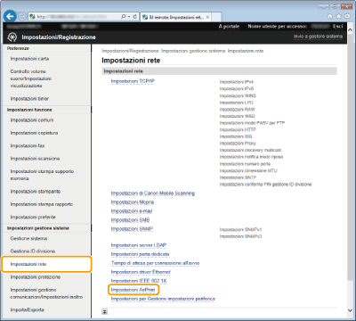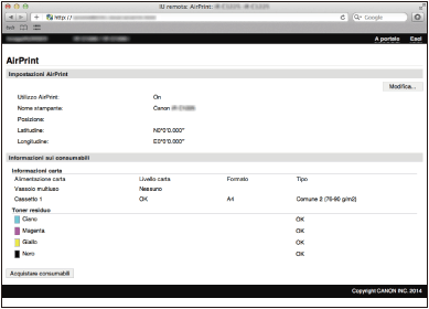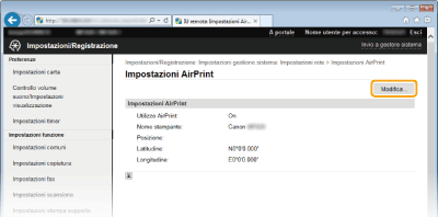 È possibile registrare le informazioni, compresi il nome della macchina e la posizione di installazione, utilizzate per identificarla. È inoltre possibile disabilitare la funzione AirPrint della macchina. Utilizzare la IU remota per modificare tali impostazioni.