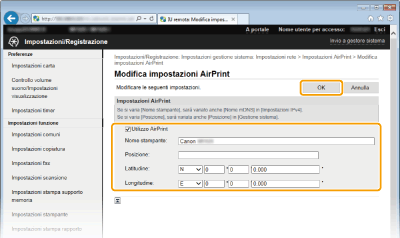 Immettere il nome e le informazioni sulla posizione di installazione per meglio identificare la macchina quando si utilizza il dispositivo Apple. Queste informazioni sono utili se sono presenti più stampanti AirPrint.