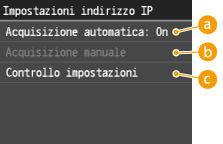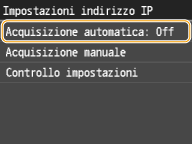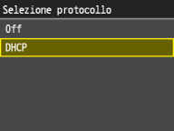 ![]() ![]() Se non si desidera utilizzare DHCP per assegnare un indirizzo IP Selezionare <Off>. Se si seleziona <DHCP> quando questo servizio non è disponibile, la macchina sprecherà tempo e risorse di comunicazione nella ricerca di questi servizi nella rete. |