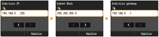 <Subnet Mask> <Indirizzo gateway>.Immettere l'impostazione utilizzando i tasti numerici, quindi toccare <Applica> su ciascuna schermata.