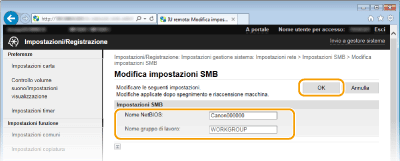 Server Message Block (SMB) è un protocollo per la condivisione di risorse, come file e stampanti, con più di un dispositivo in una rete. La macchina utilizza SMB per archiviare documenti digitalizzati in una cartella condivisa. A seconda della rete, sarà necessario impostare il nome NetBIOS e il nome del gruppo di lavoro.