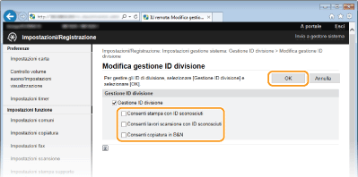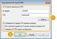 Fare clic per verificare che siano stati immessi i corretti ID e PIN. Questa funzione non è disponibile se macchina e computer sono collegati tramite porta USB o WSD (Web Services on Devices). [Confermare ID reparto/PIN durante la stampa]/[Conferma ID reparto/PIN prima di inviare fax]
