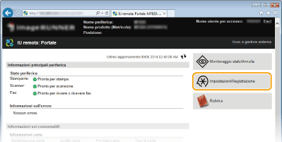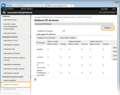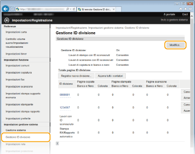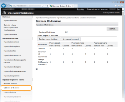 [Totale pagine ID divisione]È possibile verificare il numero totale delle pagine copiate, stampate, digitalizzate o inviate via fax per ciascun ID reparto.