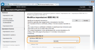 Selezionare la casella di controllo [Utilizzo IEEE 802.1X], immettere il nome di accesso nella casella di testo [Nome accesso] e specificare le impostazioni richieste.