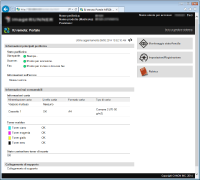 È possibile verificare lo stato dei documenti o della macchina e modificare anche alcune delle impostazioni. Se si desidera eliminare i documenti di stampa, immettere il nome utente dei documenti in [Nome utente]. Il nome utente viene automaticamente impostato sui documenti di stampa in base a informazioni come nome computer o nome di accesso al computer.