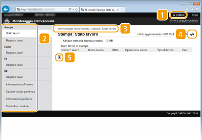 Visualizza lo stato dei documenti di stampa correnti e la cronologia di stampa, copia, invio e documenti ricevuti. È inoltre possibile controllare lo stato della macchina.