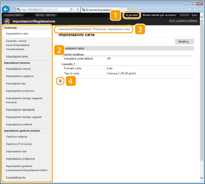 Visualizza la pagina [Impostazioni/Registrazione]. Dopo aver eseguito l'accesso in modalità Gestore sistema, è possibile modificare le voci di impostazione e salvare/caricare i dati registrati.