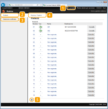 Visualizza i numeri a selezione codificata e l'elenco dei Preferiti registrati nella Rubrica. Se è stato effettuato l'accesso in modalità Gestore sistema, è inoltre possibile registrare o modificare la rubrica.