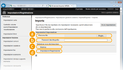 È possibile salvare i dati di impostazione delle opzioni di menu sul computer, oppure registrare i dati salvati nella macchina. I dati esportati possono essere importati. Se si utilizza lo stesso modello, altre macchine possono importare i dati esportati da questa macchina e viceversa. È possibile eseguire queste operazioni solo dopo aver effettuato l'accesso in modalità Gestore sistema.