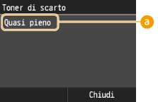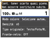 <Quasi pieno>: il serbatoio del toner di scarto è quasi pieno. Si consiglia di sostituire il serbatoio con uno nuovo.