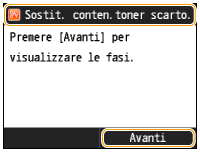 Il messaggio visualizzato varia in base alla quantità di spazio residuo nel serbatoio del toner di scarto. Seguendo le istruzioni del messaggio, accertarsi di avere un serbatoio del toner di scarto per la sostituzione o preparasi a sostituire l'attuale serbatoio.