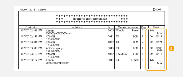Quando viene visualizzato un codice di errore). Per le e-mail, i Rapporti gestione comunicazioni indicano il risultato di trasmissione tra la macchina e il server di posta, non tra la macchina e l'indirizzo di destinazione.